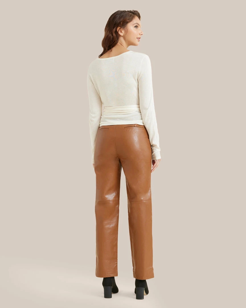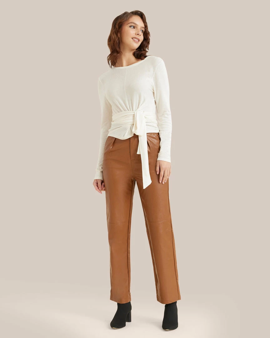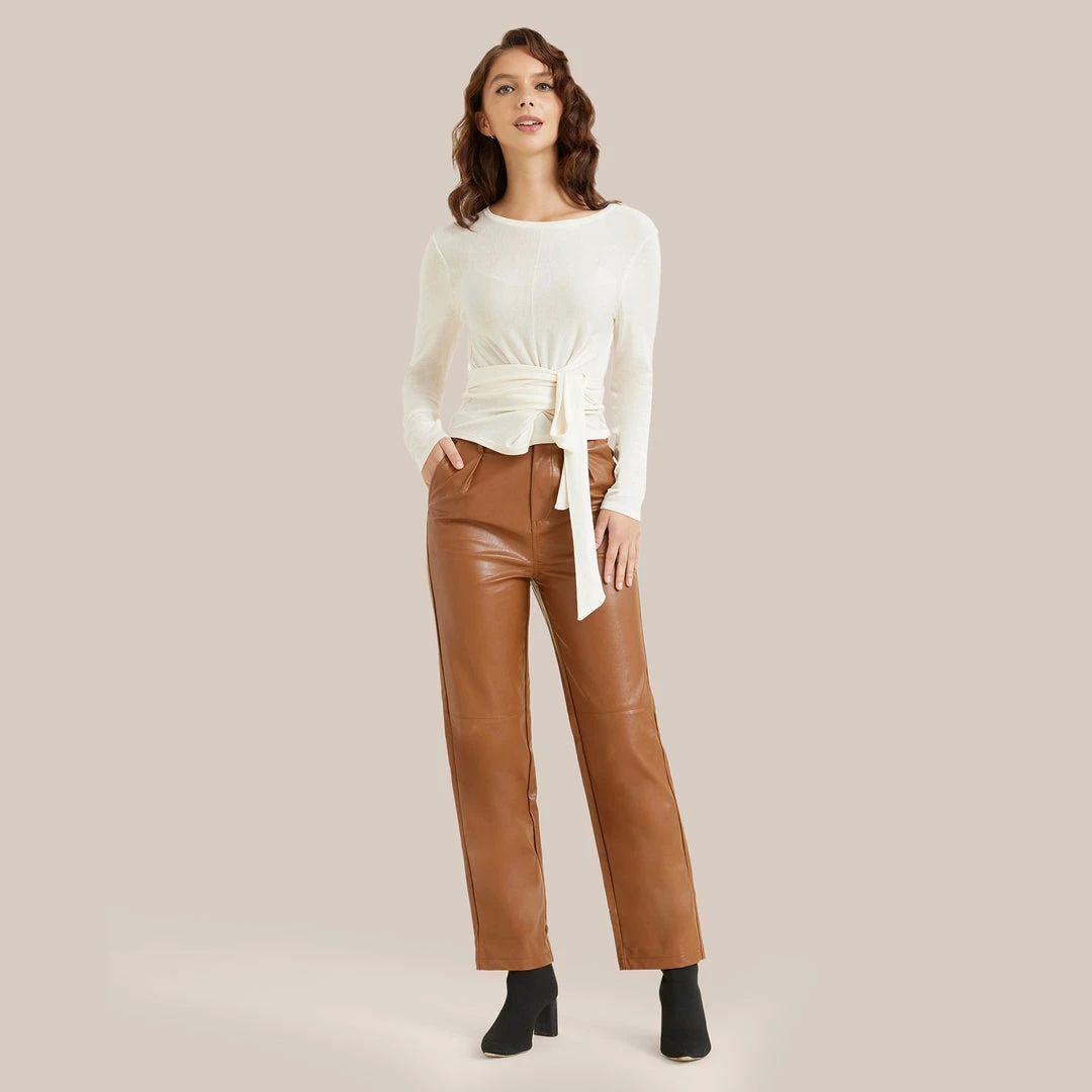 This pair of chic, streamlined trousers are cut from a super soft vegan leather. Style with a pair of boots and a relaxed sweater for a cozy yet fashionable daytime look.