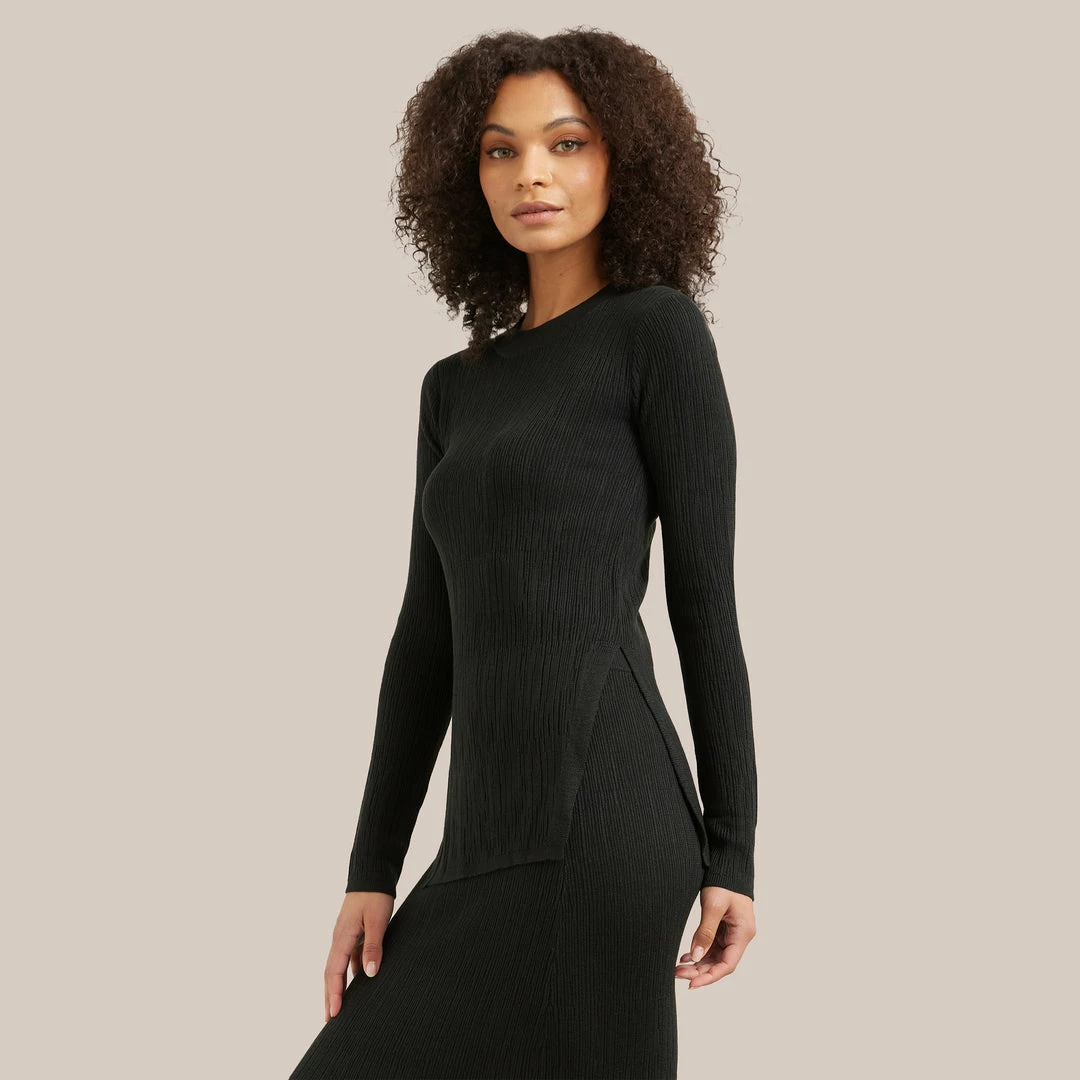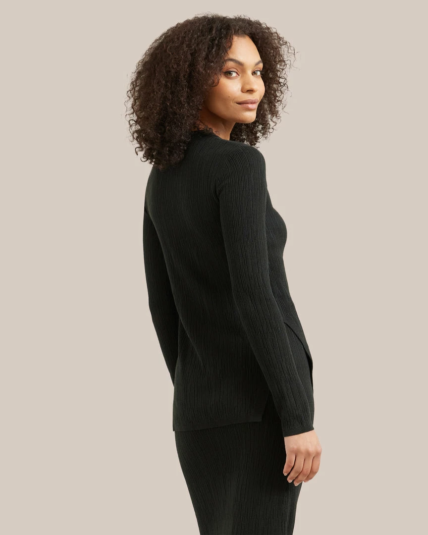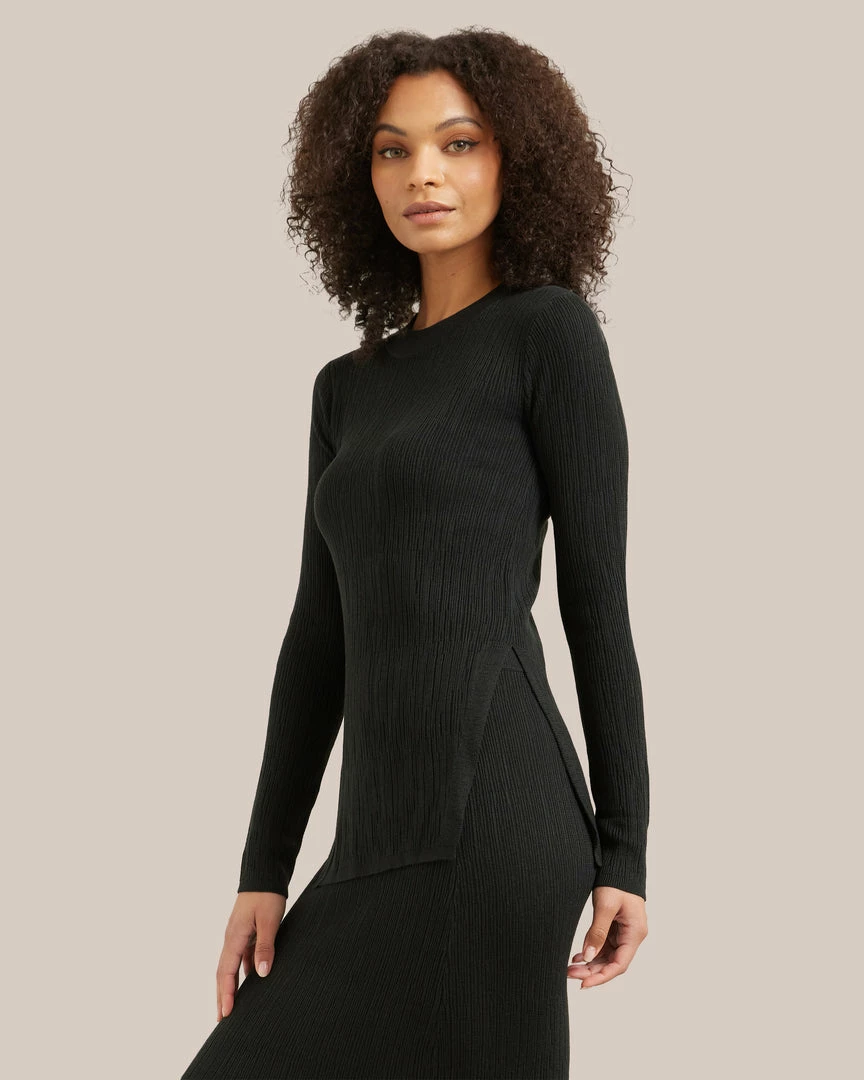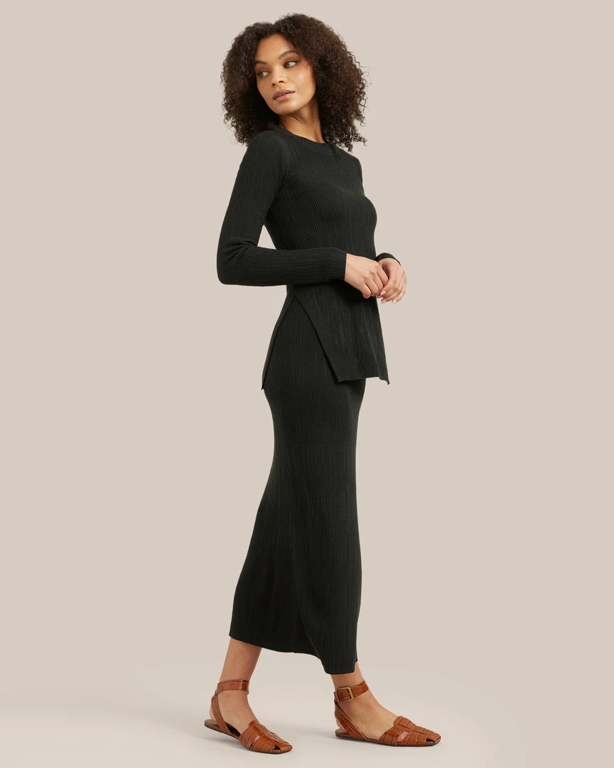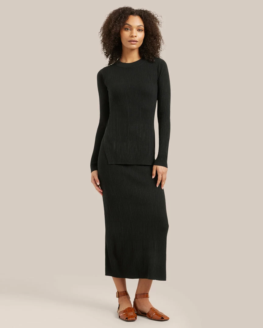 A fitted staple knit with a chic, textural pattern, Romy is an endlessly wearable top. Wear with your favorite jeans, or pair with the Michelle skirt for a polished, easy set.Â