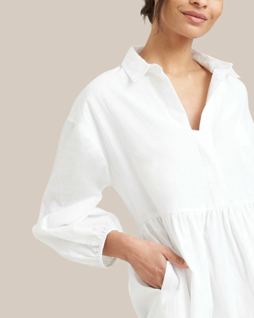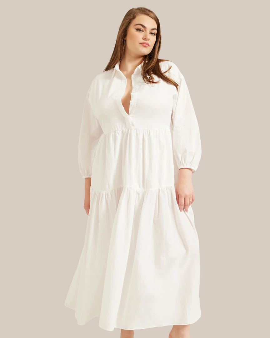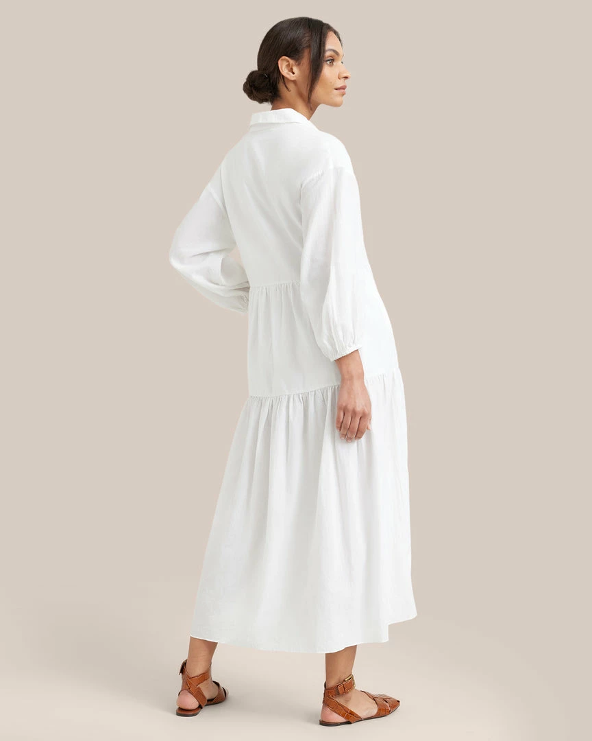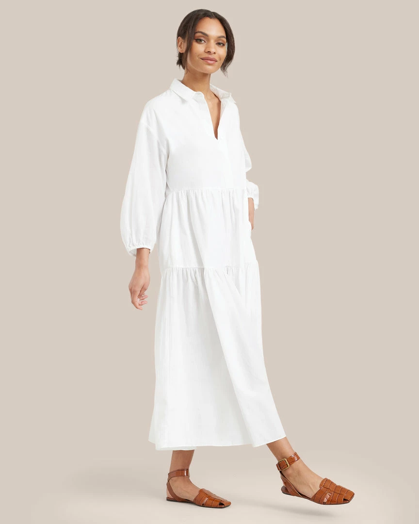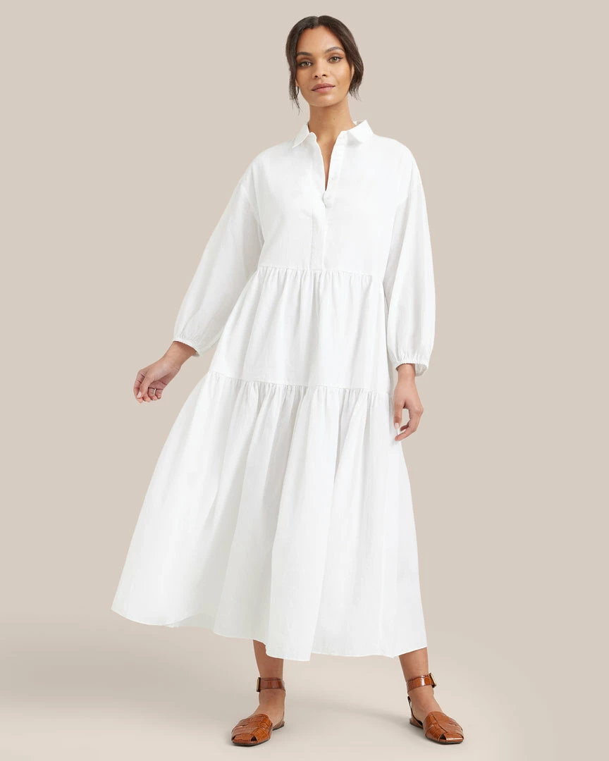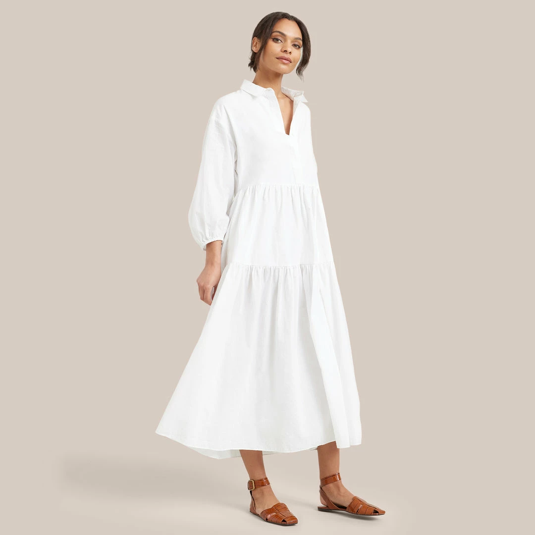 Our shirting-inspired interpretation of the season’s breeziest tiered maxi dresses, this dress is a subtle statement. This thoughtfully constructed and universally flattering cotton piece is the absolute easiest one-and-done outfit of the season.