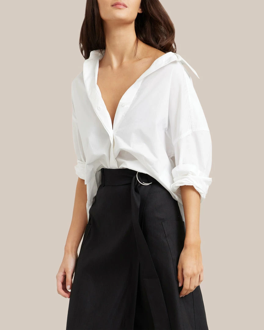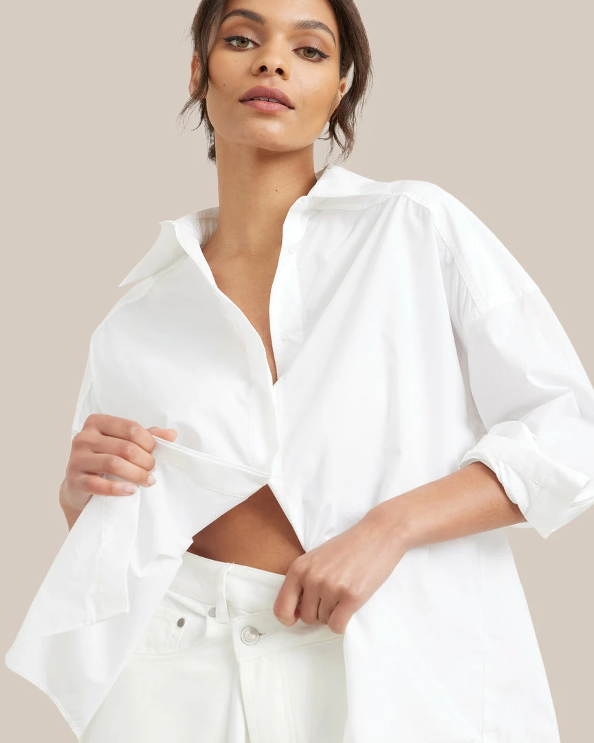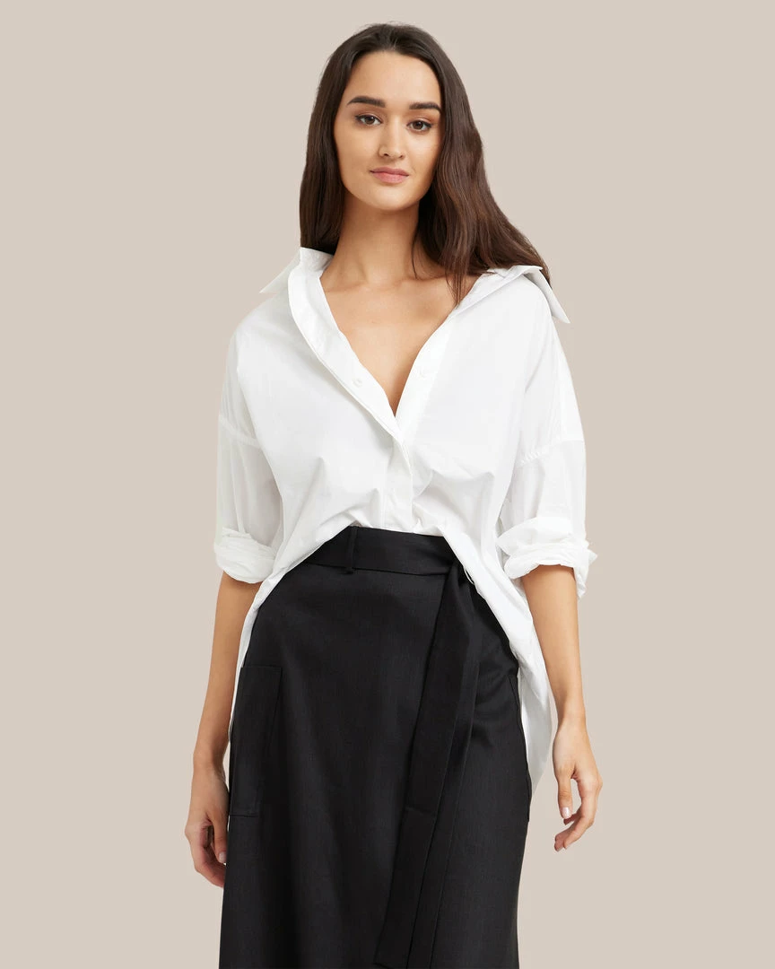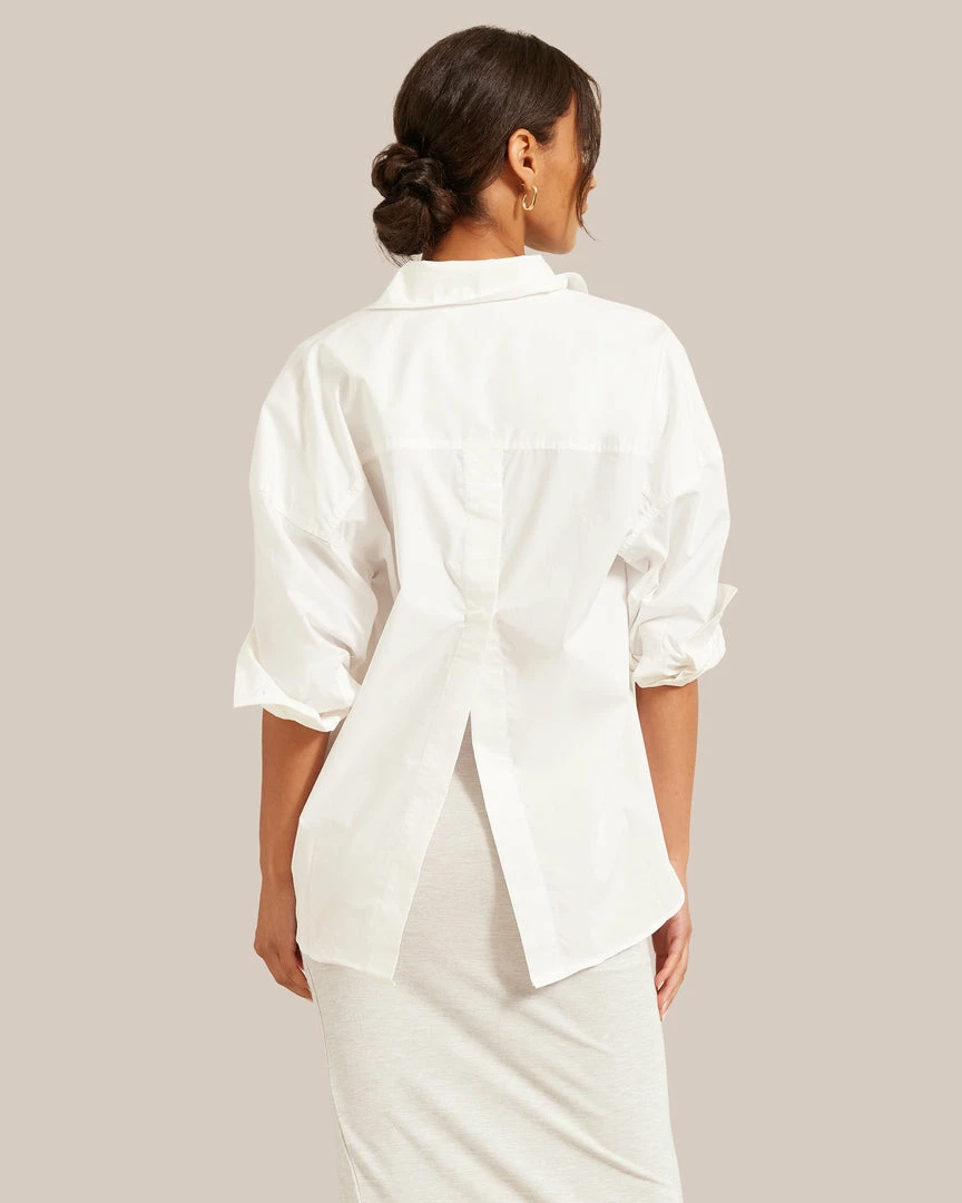 A refreshing update to a basic, this crisp white button-down shirt is cut for an oversized fit. We love wearing it untucked over slim pants for work or with jeans on the weekend, to showcase the surprise split detail in the back.