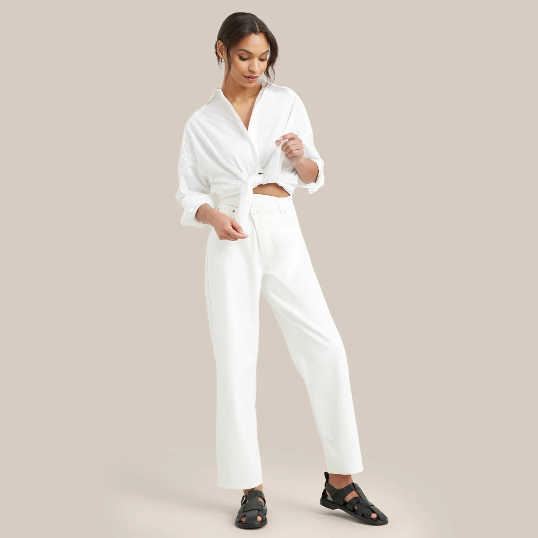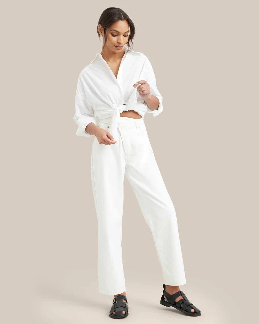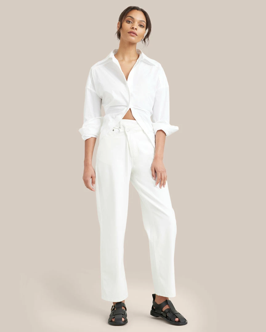 A refreshing update to a basic, this crisp white button-down shirt is cut for an oversized fit. We love wearing it untucked over slim pants for work or with jeans on the weekend, to showcase the surprise split detail in the back.