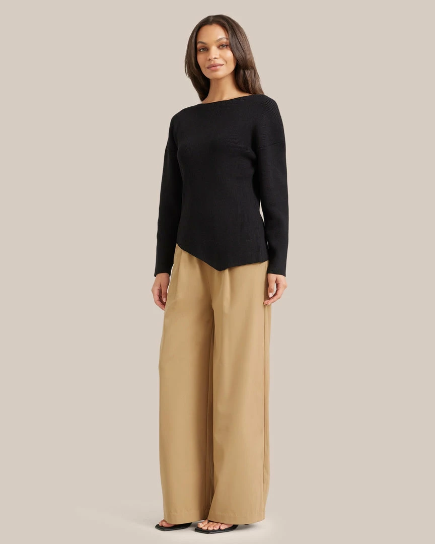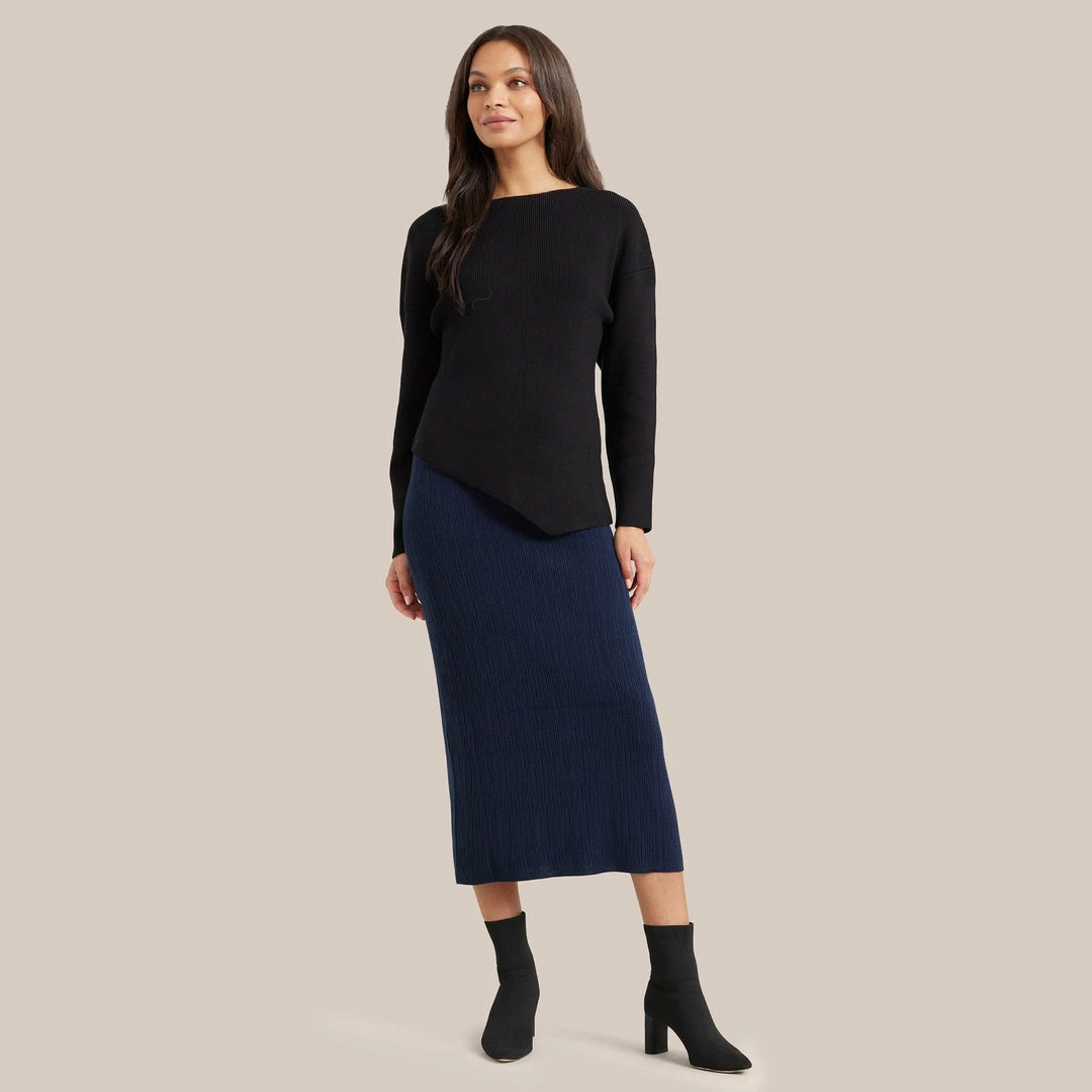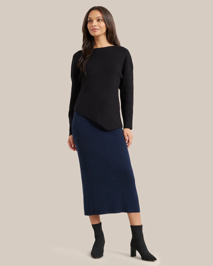 A design-forward sweater in a luxe, ribbed knit. Jourdan will be a new wardrobe go-to to elevate any outfit with her bold, statement-making asymmetric hem.Â