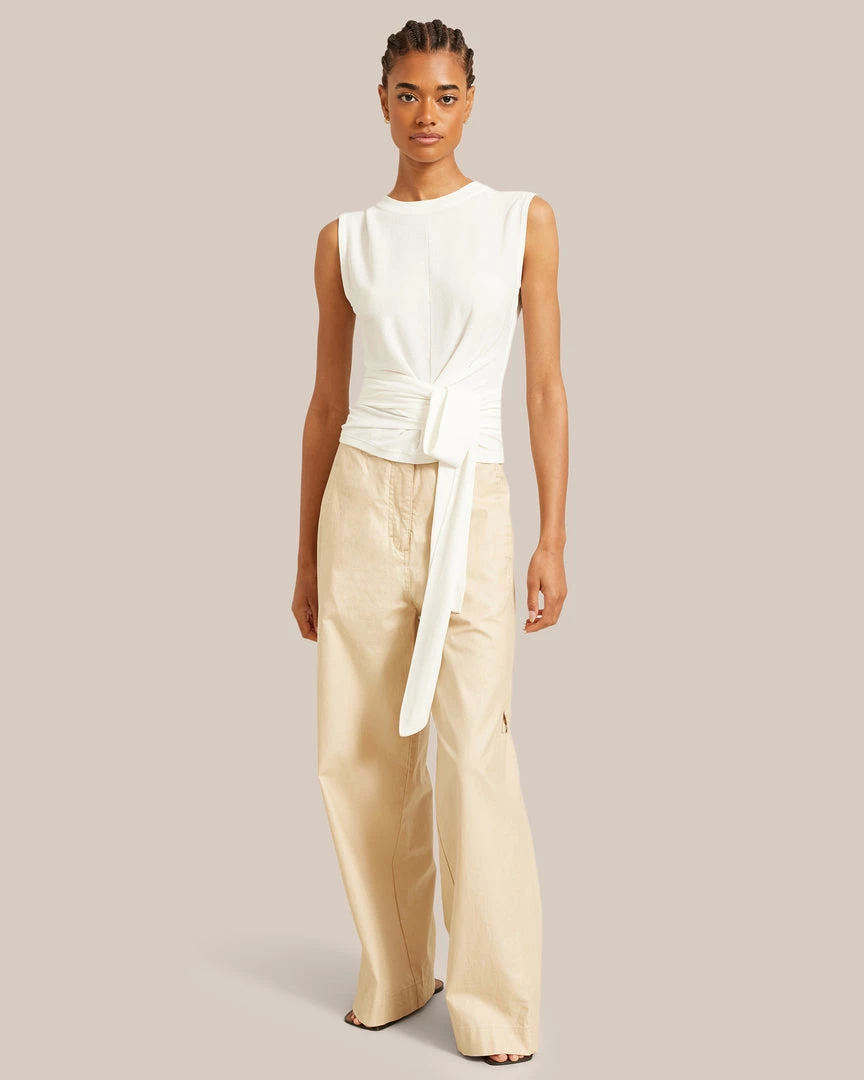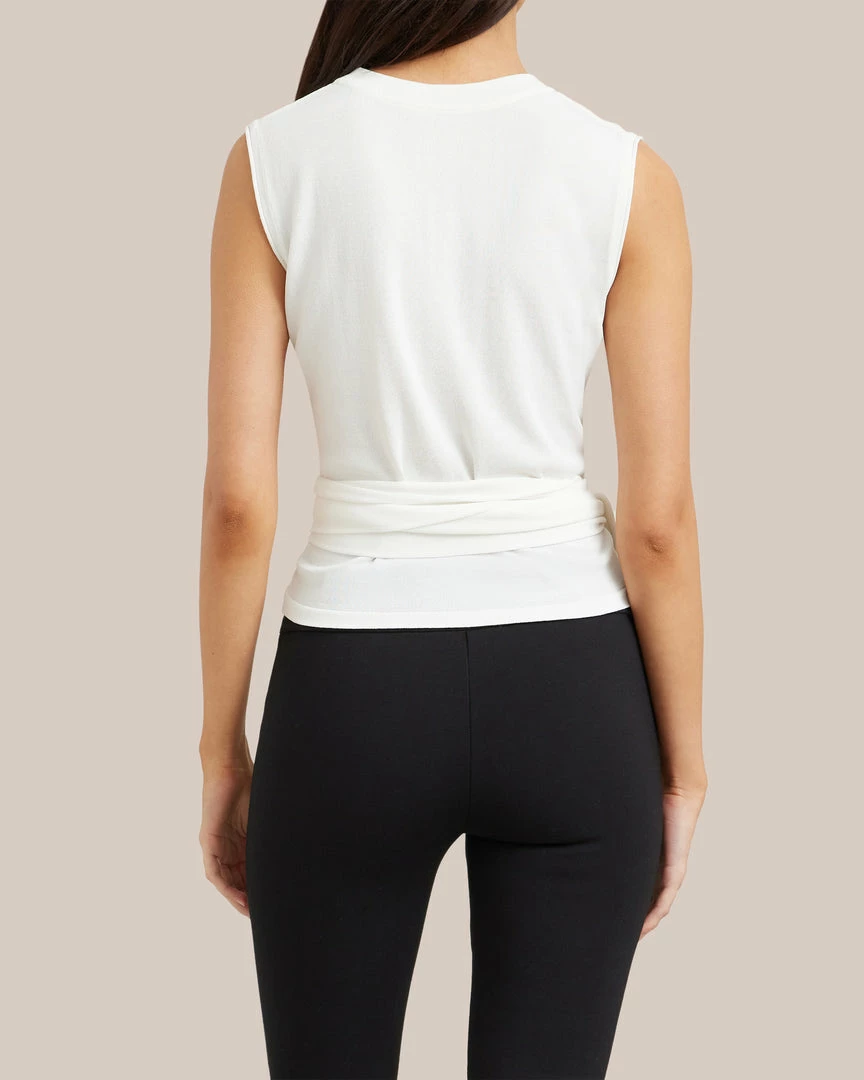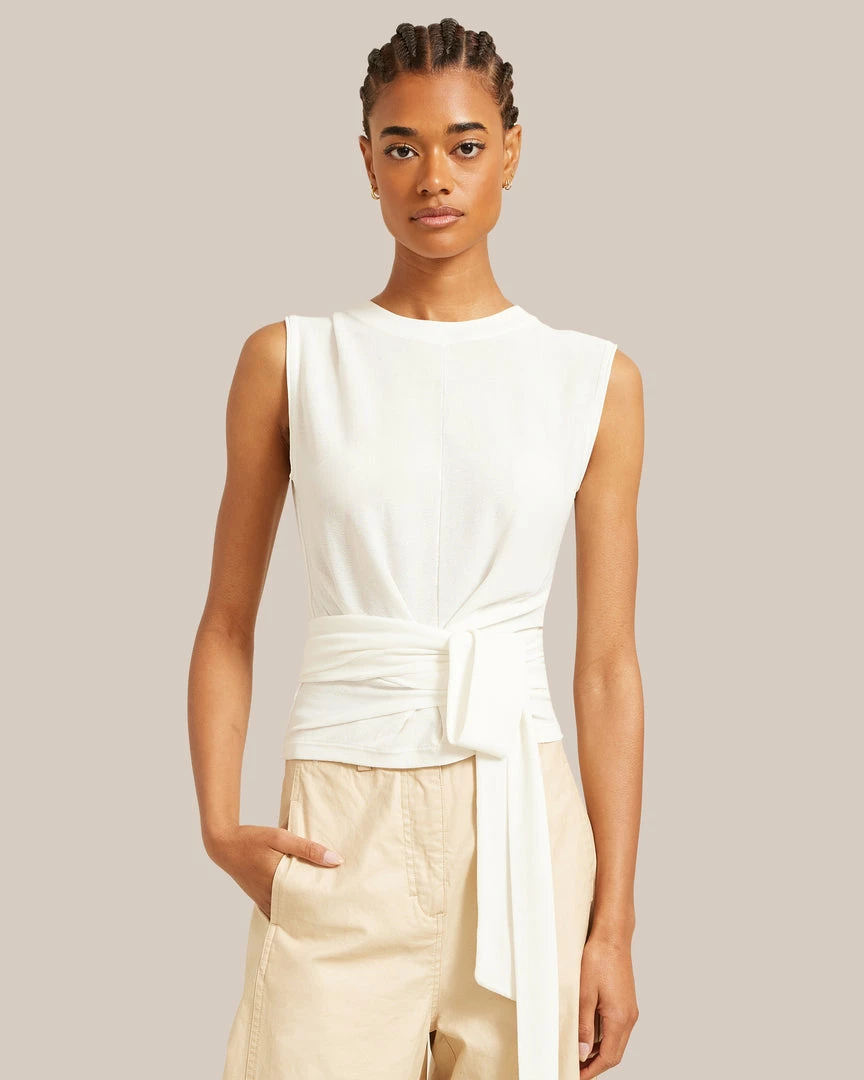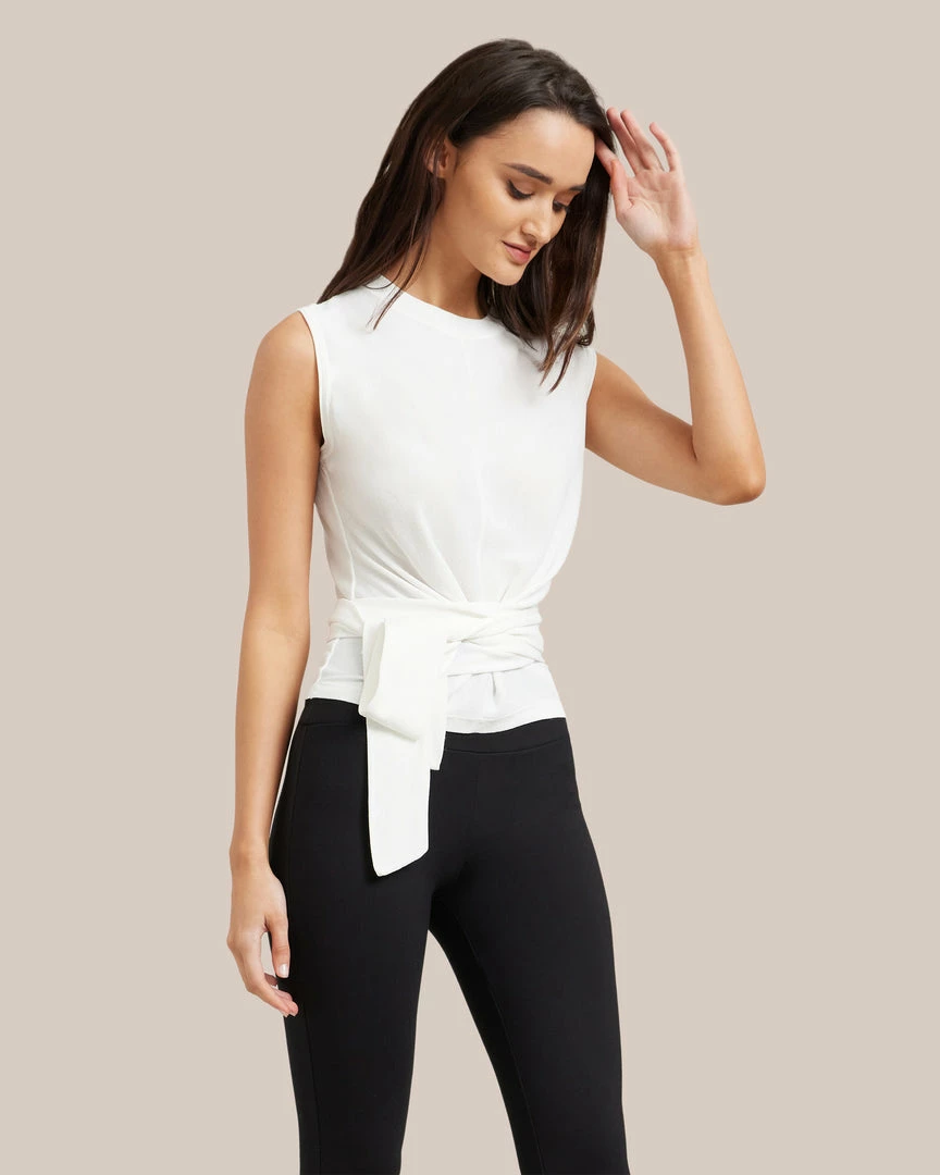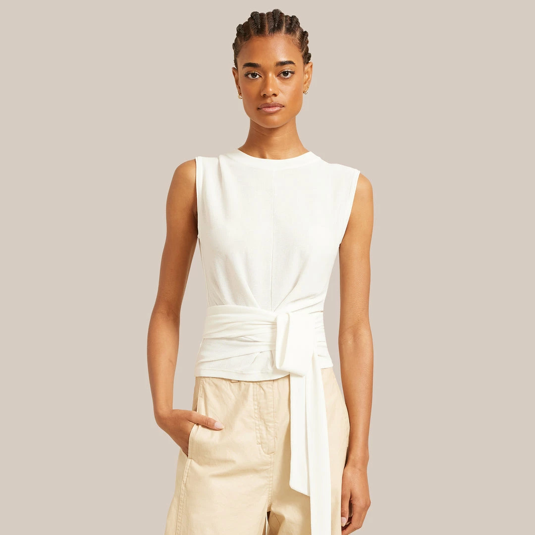 A flattering, slightly cropped sleeveless tee with wrap detailing — the perfect modern update to your favorite tank.